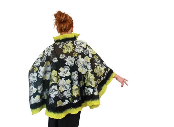 La laine Mérinos feutrée à chaud qui forme la bordure est elle aussi noire et vert acide.