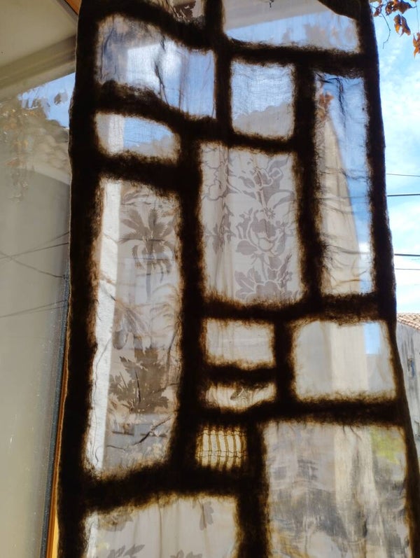 Etole légere en patchwork de soie de murier, gaze de soie, voile de coton et laine Mérinos.