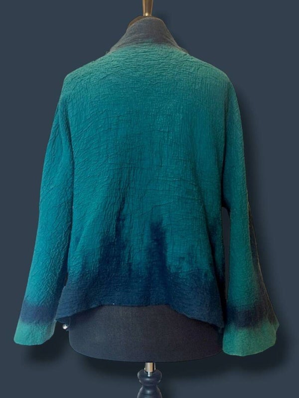 Le dos est sublimé par un délicat motif en laine dégradée, ajoutant une touche artistique et unique, tandis que les manches, légèrement coniques, se terminent avec un détail raffiné dans un turquoise plus clair.