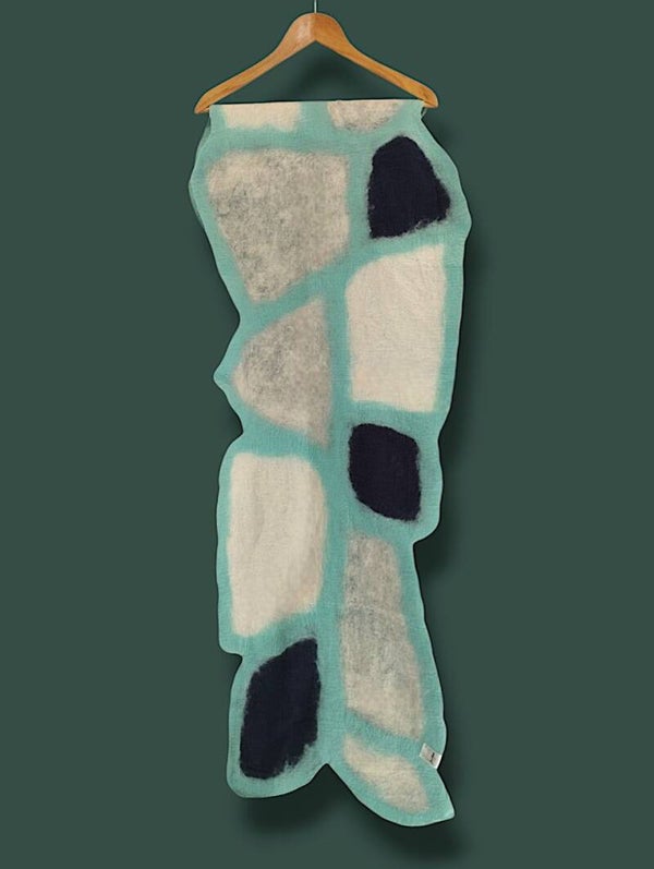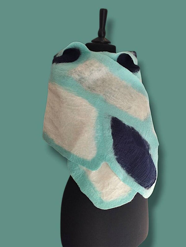 En laine mérinos d'Arles feutrée sur un voile de coton, réalisée à la main avec la technique du Nuno.